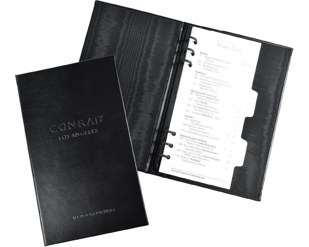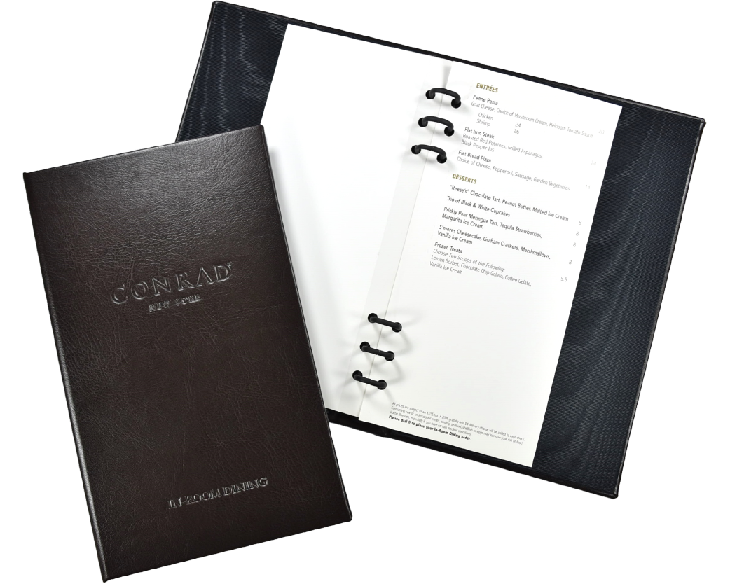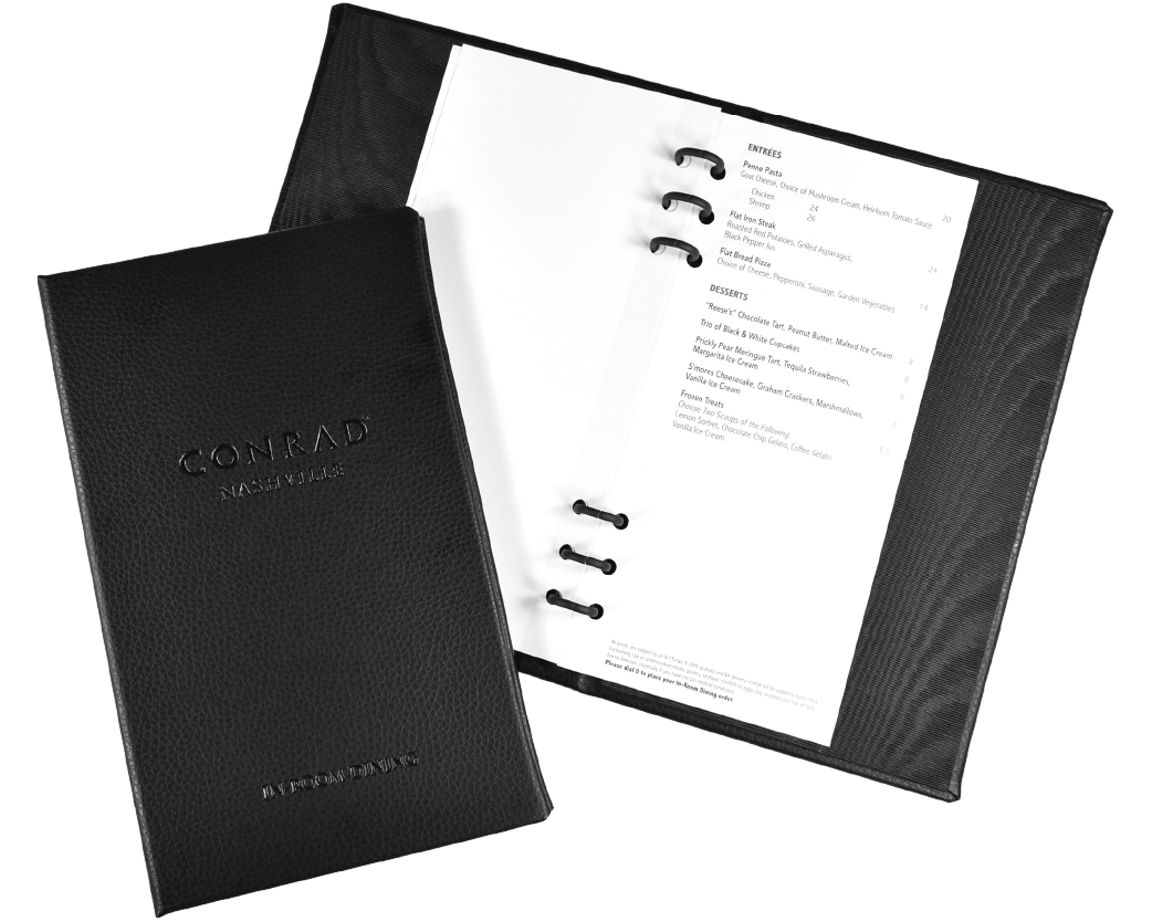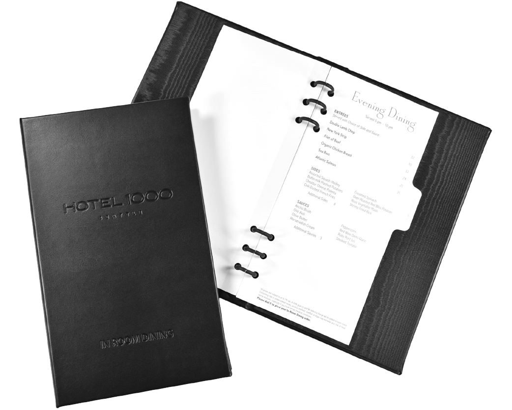 Most hotels have experienced increased revenue by separating out the In-Room Dining to its own binder. As a direct manufacturer, we specialize in providing an in-room piece that can complement your guest room items perfectly.